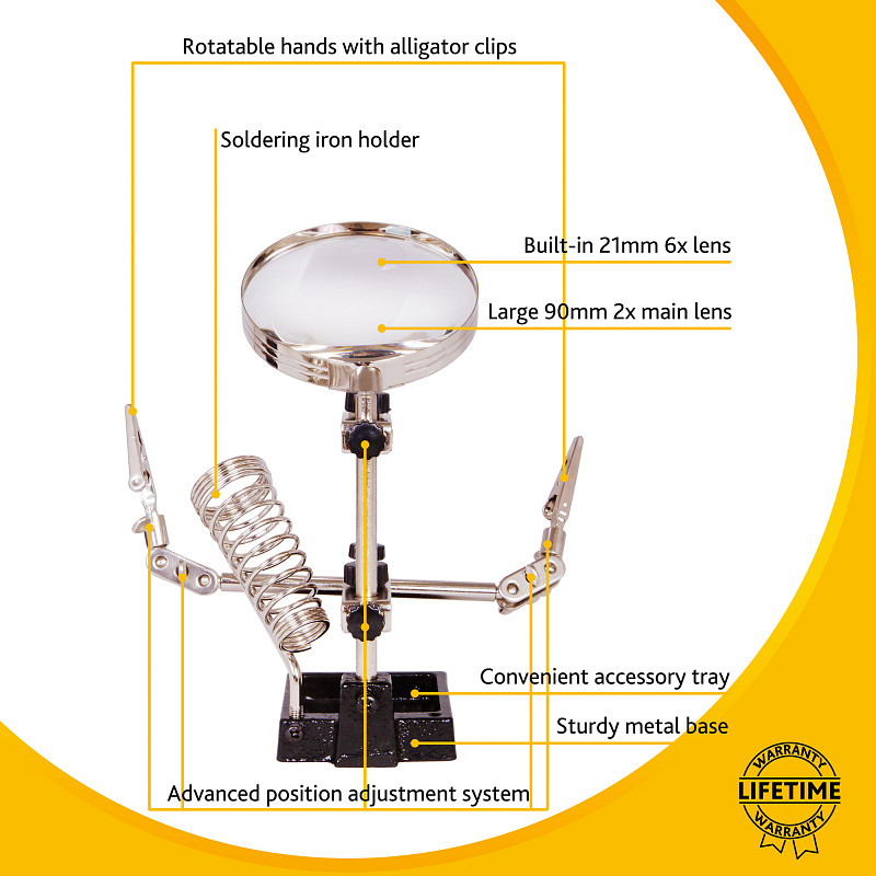 La lente è realizzata in vetro polimero ottico e fornisce immagini nitide e dettagliate di qualsiasi oggetto ingrandito. Il suo corpo in metallo resistente assicura stabilità e una lunga vita utile. Tutte le lenti di questa serie sono dotate di terza mano per il supporto di oggetti.