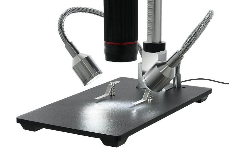 L’illuminazione consiste in due faretti LED a luminosità variabile. Sono fissati su dei supporti flessibili, il che permette di dirigere la luce sul campione nel modo più preciso possibile. I faretti sono controllati (regolazione della luminosità, accensione) da un piccolo interruttore sul cavo di alimentazione.