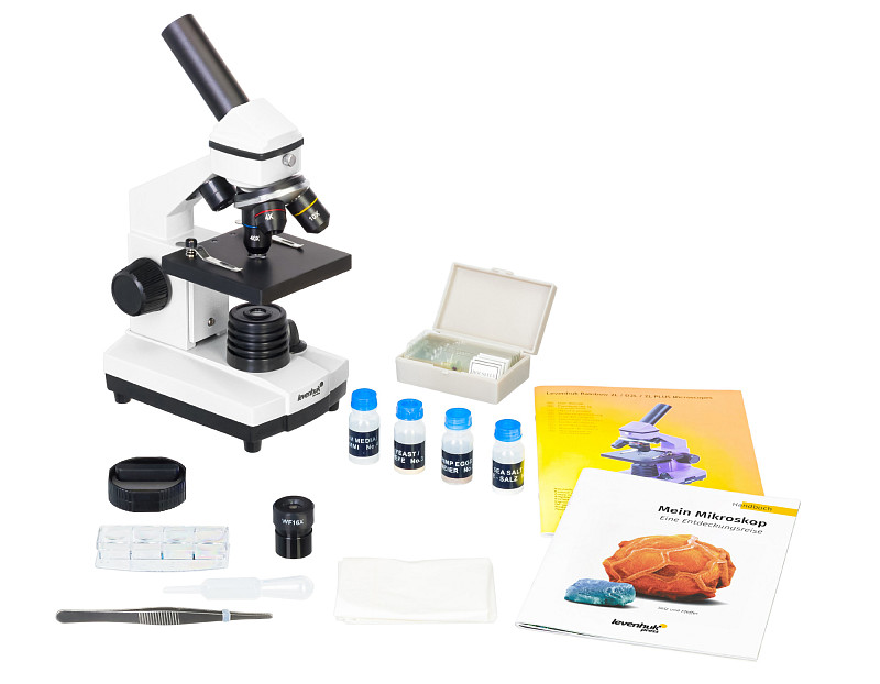 La confezione comprende il kit per esperimenti Levenhuk K50. Contiene tutto il necessario per i vostri primi esperimenti: vetrini da microscopio pronti all’uso, strumenti speciali per farli e un’utilissima guida con informazioni sul microscopio, consiglio per l’uso e descrizioni di esperimenti.