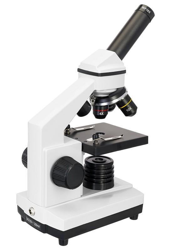 Il corpo affidabile è fatto in metallo – può sopportare facilmente l’uso frequente e servirvi per molti anni. Per una maggior comodità, la testa monoculare è inclinata di 45 gradi. Inoltre, può essere ruotata di 360 gradi – ed è molto comoda per il lavoro di gruppo basterà ruotare la testa senza muovere il microscopio. Lo strumento può essere usato all’interno e all’esterno – il microscopio funziona tramite presa o batterie.