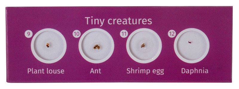 Il set di vetrini preparati Levenhuk LabZZ comprende campioni inseriti in vetrini dal design originale. È possibile usarle come supporto visivo per la botanica, la zoologia o l’entomologia. Un vero e proprio tesoro per bambini curiosi! Basta posizionare il campione sul tavolino porta campioni, ed è subito possibile osservare un pelo di topo o una zampa di mosca, una pulce d’acqua o altro ancora. Questi campioni sono adatti all’osservazione tramite microscopi di qualsiasi marchio, con illuminazione dal basso.