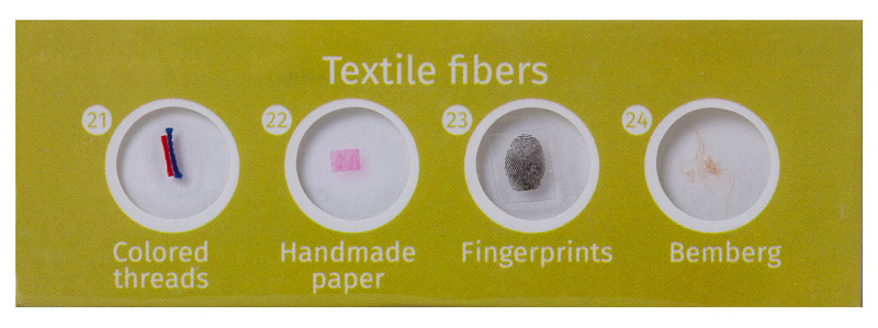 Tutti i vetrini sono suddivisi in gruppi ed etichettati: ad esempio, alcuni vetrini appartengono alla categoria “Animali”, “Piante” o “Piccole creature”. I vetrini sono ricoperti di carta colorata e presentano delle aperture tonde trasparenti. Il set è venduto in una confezione di cartone resistente, a marchio Levenhuk.
