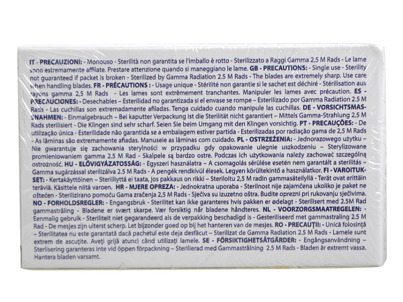 Ogni lama è sterilizzata mediante raggi gamma, protetta da carta VCI e inserita in una bustina ad apertura rapida.