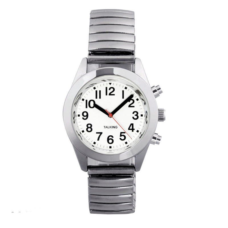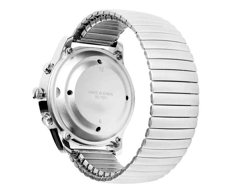 L’orologio parlante Gentleman è facilissimo da usare e presenta un’estetica elegante e classica, anche grazie alla presenza delle lancette. L’orologio Gentleman, è tendenzialmente da uomo, per le dimensioni della cassa, ma la sua estetica e il poco peso, 72 grammi, lo rendono anche unisex, quindi appetibile anche per le donne. L’orologio Gentleman, che funziona con 2 batterie al litio ha una cassa in metallo cromato acciaio, come anche il cinturino elastico e l’anello attorno al vetro, vetro che protegge il quadrante a base bianca, il quale ha numeri e lancette nere fortemente contrastanti con il bianco della base e quindi ben evidenti anche per chi ha avuto un leggero calo visivo. Sul retro della cassa c’è il coperchio, per accedere alle 2 batterie, che è in acciaio inossidabile. Tutto l’orologio è privo di nickel.