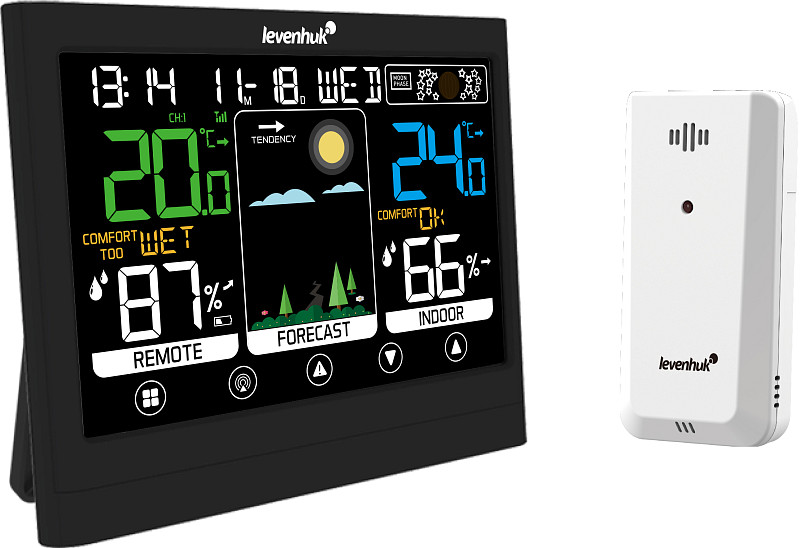 Levenhuk Wezzer Teo TH50 è un termoigrometro con controlli touch e un sensore remoto incluso. La sua funzione principale è fornire informazioni su temperatura e umidità sia al chiuso che all’aperto e di valutare questi due parametri per controllare le condizioni meteo e avvisare in caso di un loro peggioramento. È risaputo che fluttuazioni estreme nel livello di umidità possono peggiorare le malattie croniche e che le temperature eccessivamente alte o basse possono avere un impatto negativo sulla salute: questi parametri andrebbero monitorati con molta attenzione.