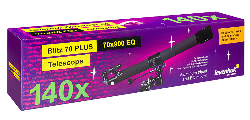 Il rifrattore acromatico Levenhuk Blitz 70 PLUS è un’ottima scelta per gli astronomi in erba. Con questo strumento è possibile osservare i pianeti del Sistema solare coi loro satelliti, alcuni oggetti del profondo cielo e le immagini dettagliate della Luna. Questo telescopio può anche essere utilizzato per le osservazioni terrestri.