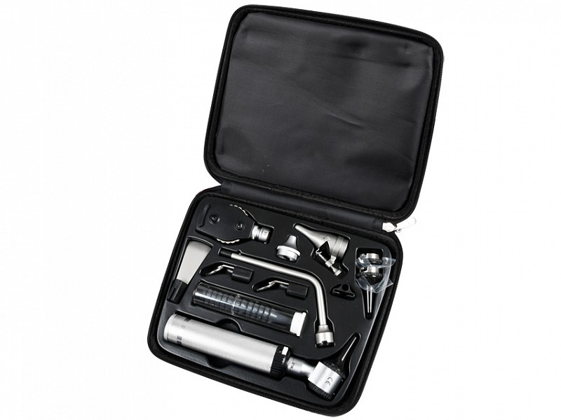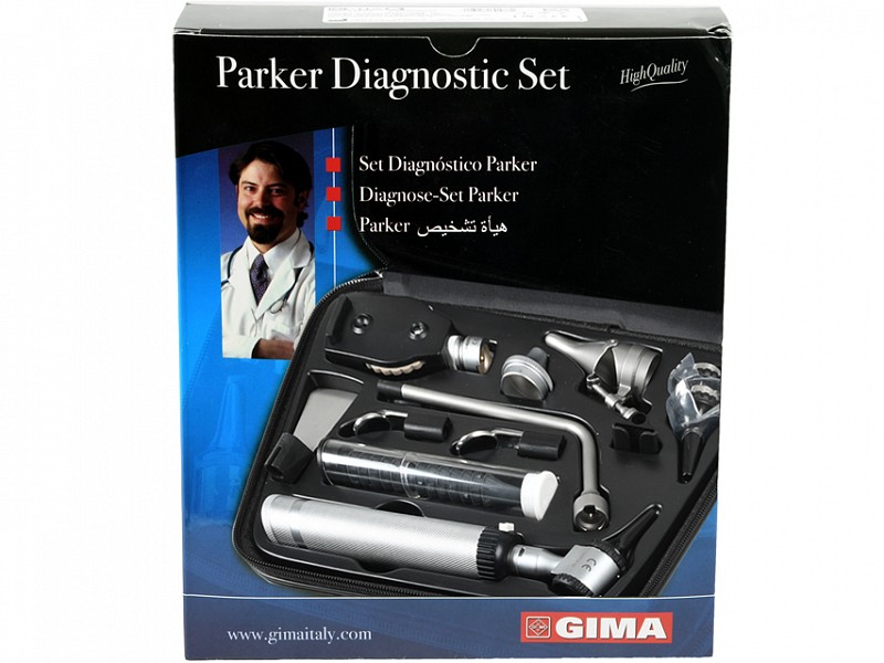SET PARKER GRANDE CON OFTALMOViene fornito in un leggero e robusto astuccio in nylon contenente: l’otoscopio Parker 2,5 V, con manico ricaricabile, 3 speculum auricolari autoclavabili (Ø 2,5, 3,5 e 4,5 mm), 2 specchietti laringei (misura 3 e 4), lampada gola con braccio ricurvo, abbassalingua, speculum nasale regolabile, con l'aggiunta di una testina oftalmoscopio, di un supporto per abbassalingua monouso e 1 tubo di 14 speculum auricolari monouso (7x Ø 2,5, 7x Ø 4 mm).