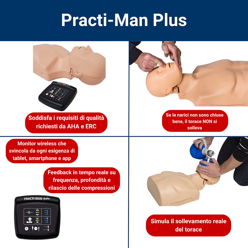 - Manichino BLS 2-in-1 Practi-Man Plus - Light: consente l’addestramento su adulto e bambino con RCP Feedback digitale per il monitoraggio della qualità delle compressioni toraciche.