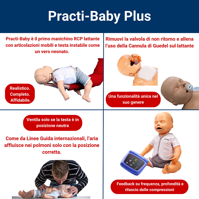 - Manichino BLS Lattante Practi-Baby Plus - Light: progettato per la simulazione della RCP su lattanti, anch’esso dotato di feedback digitale.