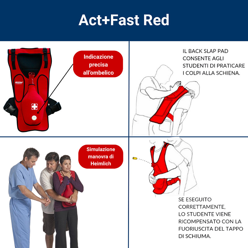 - Act+Fast Anti Choking Trainer Red: simulatore per la manovra di Heimlich, dotato di cuscinetto imbottito dorsale per esercitarsi anche nelle pacche interscapolari.