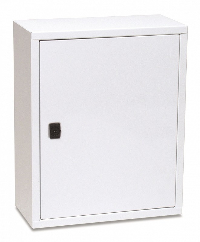 Armadietto in metallo verniciato con polvere epossidica di colore bianco con 2 vani, 1 ripiano interno e serratura con chiave.