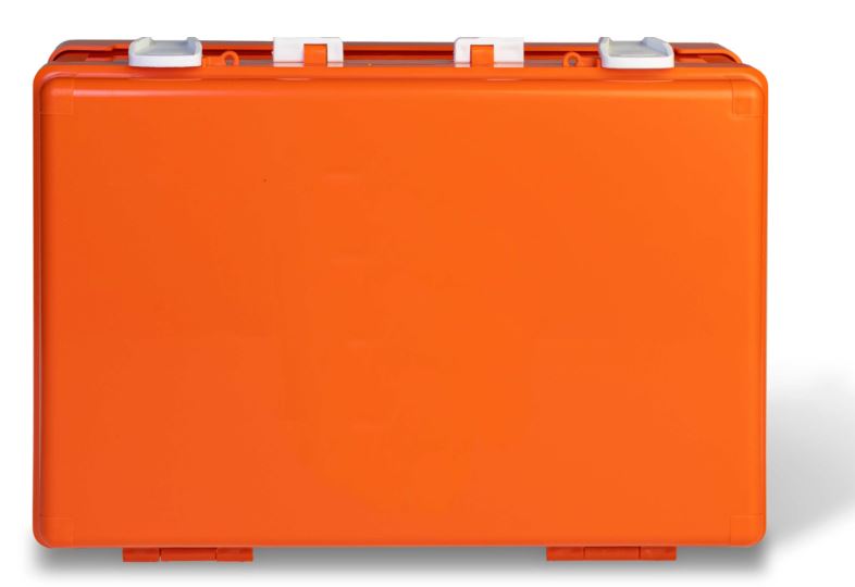 Valigetta in plastica vuota color arancio.