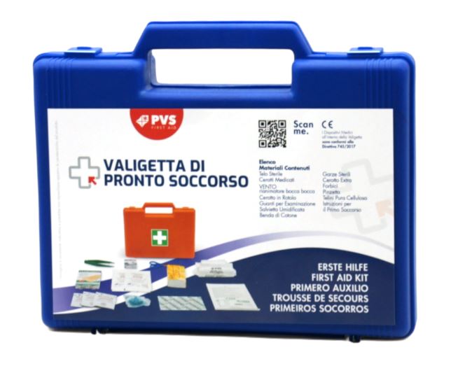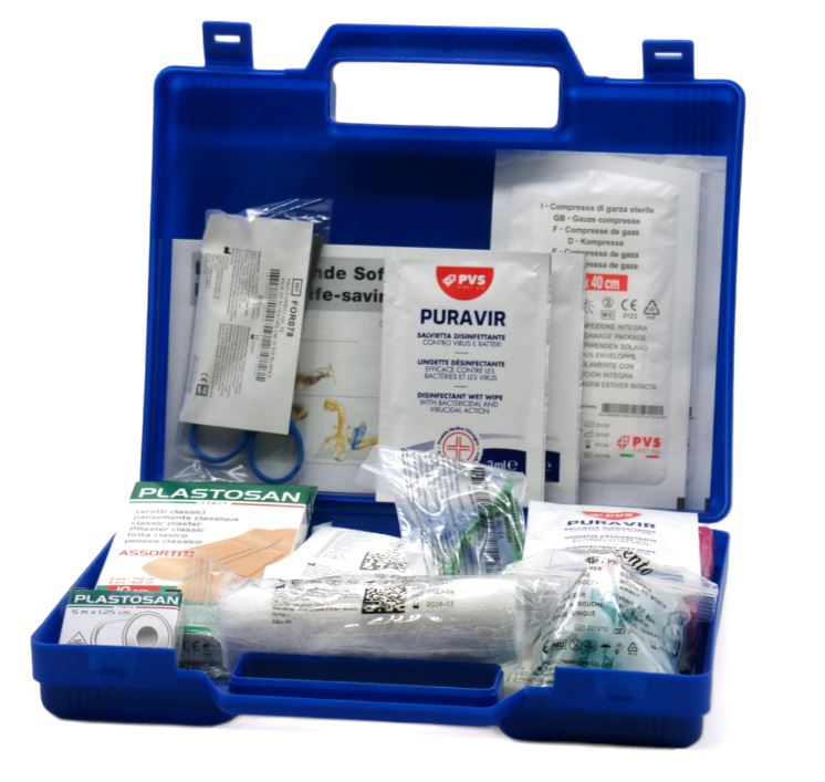 Piccola cassetta di pronto soccorso adatta ad essere utilizzata ovunque ed in ogni occasione: a casa, in ufficio, in auto, in barca.
