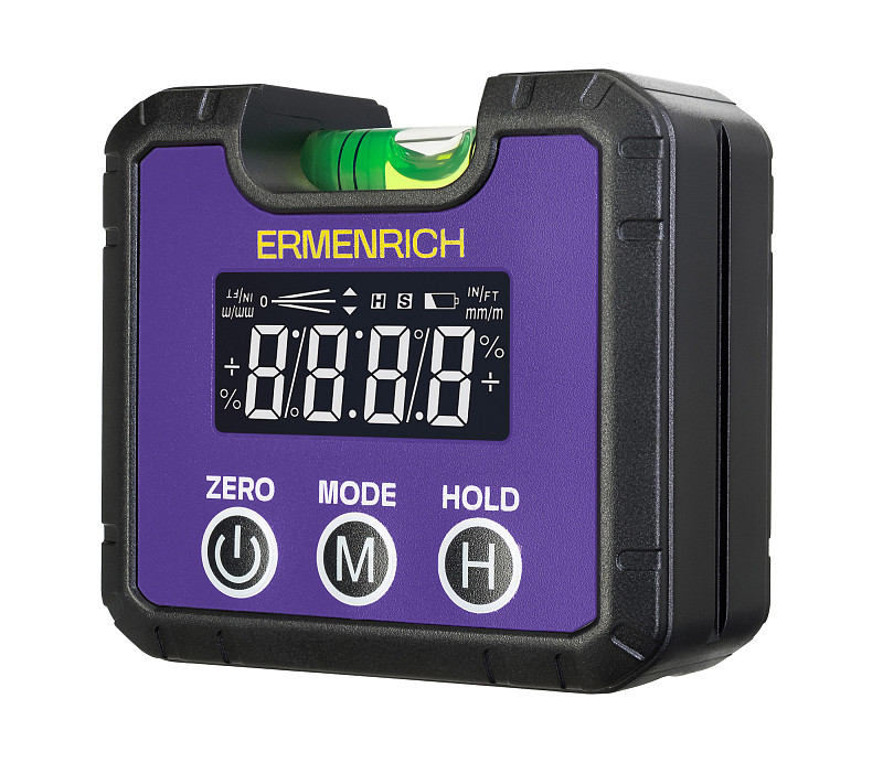 La livella digitale Ermenrich Verk LQ30 è uno strumento perfetto per qualsiasi lavoratore edile, installatore, esperto di rifiniture, operatore di macchinari di produzione, ecc. Si rivelerà sicuramente utile anche per i lavori di riparazione in ambito casalingo. Questo strumento misura gli angoli con angolazione entro i 360° (4x90°), mostrando il grado di inclinazione e la sua direzione sullo schermo LCD. I valori misurati sono visualizzati in gradi, ma possono essere selezionate anche altre unità di misura. Questo strumento misura l’angolo di pendenza e aiuta a livellare gli oggetti nel modo più efficiente possibile. Una livella a bolla integrata rende più semplice il corretto posizionamento dello strumento su qualsiasi superficie.