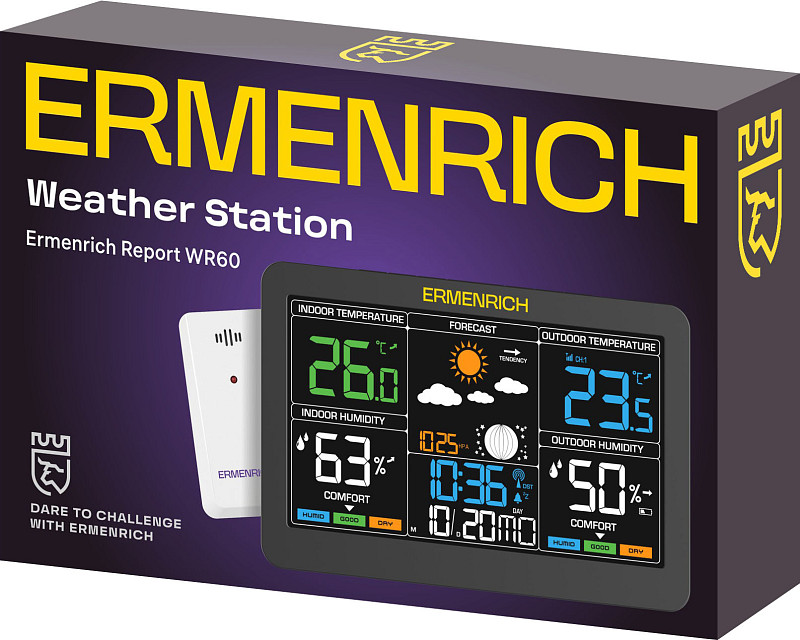 La stazione meteorologica domestica Ermenrich Report WR60 aiuta a monitorare i principali dati atmosferici, tra cui temperatura e umidità interne ed esterne, e pressione atmosferica. La stazione base ha un orientamento orizzontale, un luminoso schermo a matrice VA, un design elegante e può essere installata a parete o su un tavolo. Le sue dimensioni sono relativamente compatte e il corpo nero opaco si adatta facilmente a qualsiasi interno. Lo schermo è visivamente suddiviso in sei aree rettangolari, ciascuna dedicata alla visualizzazione di informazioni diverse. La stazione meteorologica dispone di un orologio integrato con sveglia e calendario. Lo schermo mostra pertanto l’ora, il mese, la data e il giorno della settimana correnti.