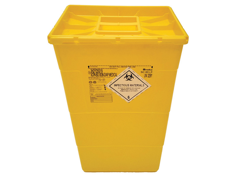 Contenitori per smaltire rifiuti ospedalieri speciali, in 3 misure, con 2 coperchi diversi.