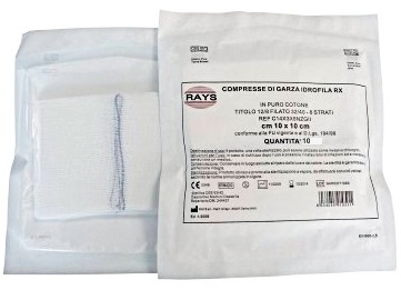 Compresse di garza monouso, sterili, di puro cotone idrofilo, colore bianco candido, con filo di bario, a 16 strati, con bordi tagliati rivolti all’interno.