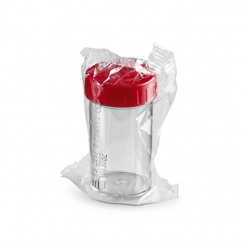 Il contenitore per urina da 60 ml è realizzato in polipropilene trasparente e sterile, con un tappo a vite rosso, ideale per l'uso in ambito medico. Ogni contenitore è confezionato singolarmente per garantire la massima igiene e sicurezza.