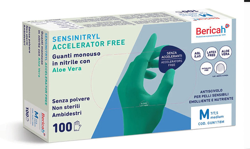 Guanti in nitrile Sensinitryl Accelerator Free Bericah, ideali per l’uso in ambito sanitario e ospedaliero, sono progettati per garantire la massima protezione e comfort anche durante utilizzi prolungati. Realizzati in nitrile di alta qualità, sono privi di lattice, ftalati e agenti acceleranti, riducendo significativamente il rischio di reazioni allergiche, rossori o screpolature cutanee.