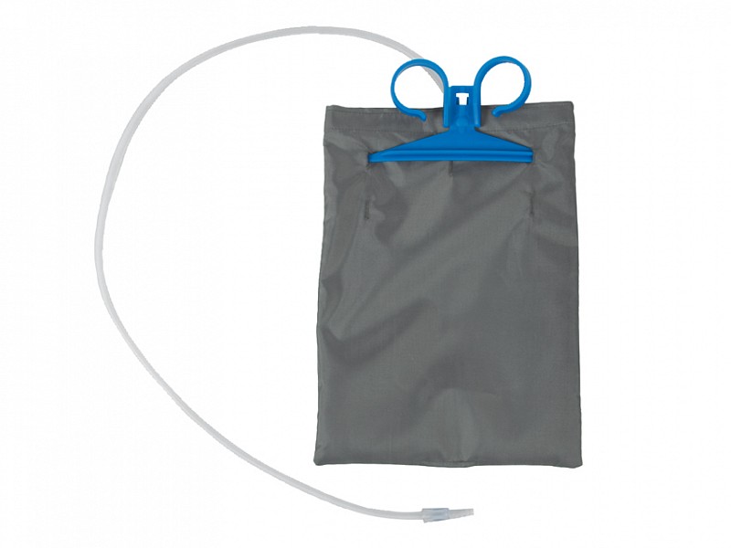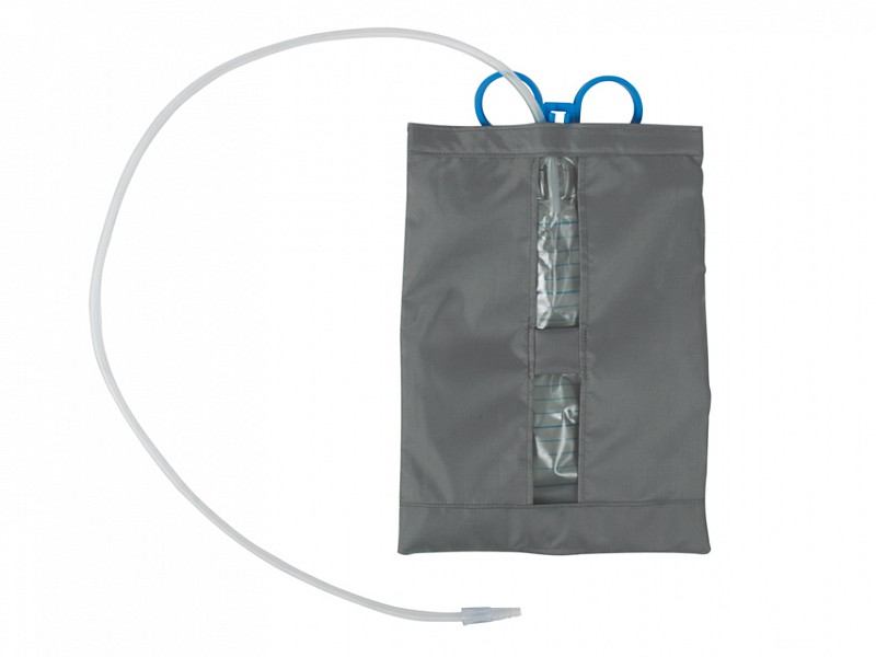 Sostegno per sacche urina con copertura riutilizzabile.Il livello di urina è visibile.