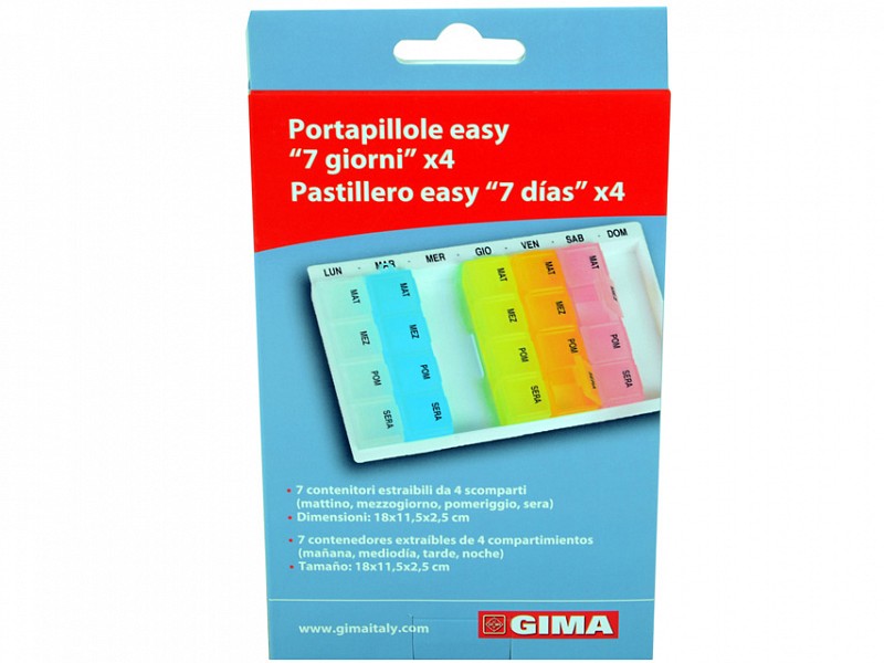 - 7 contenitori estraibili da 4 scomparti (mattino, mezzogiorno, pomeriggio, sera)