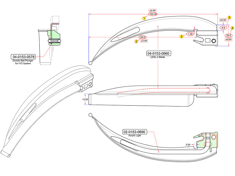 Scelta di 7 lame Miller 0,1 e McIntosh 1, 2, 3, 4, 5 per uso ospedaliero quotidiano. Conformi a ISO 7376 Green System.