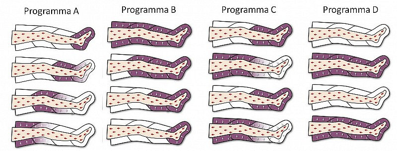 Massaggio intenso: le camere vengono riempite d’aria una alla volta mantenendo gonfie le precedenti fino al gonfiaggio completo (per esempio nel gambale, tutta la gamba sarà sotto pressione), per poi sgonfiarsi totalmente e riprendere il ciclo partendo dalla prima camera (dal piede nel caso del gambale, dalla mano nel caso del bracciale) - Programma C